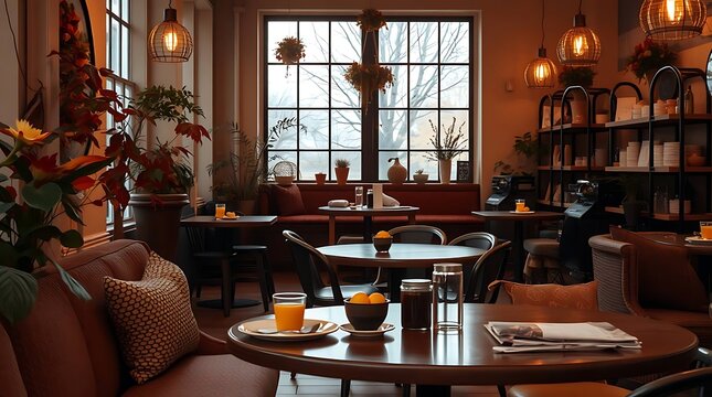 Cozy cafe interior with steaming coffee on elegant wooden table