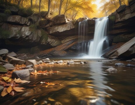 Soft focus captures the warm glow of autumn sunlight on a Tennessee waterfall, warm glow, waterfall