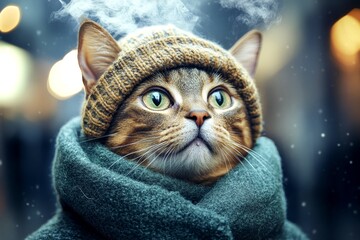 Sad cute adult cat oriental shorthair in winter warm clothes, cold breath from nose and mouth in chilly air. Social digital ads - animal care. Problem of endangered animals. Social pet drive.