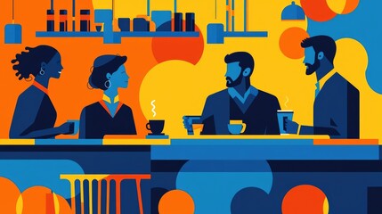 Modern Cafe Gathering: Vibrant Illustration of People Socializing in Bright, Abstract Coffee Shop