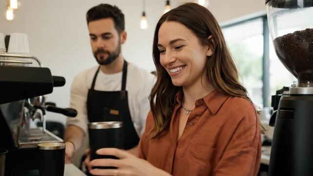 Smiling barista handing coffee to a customer, creating a warm and friendly atmosphere in a cozy café. A moment of connection and service.