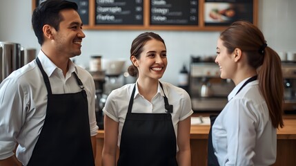 Friendly café staff in conversation during work shift inside modern coffee shop environment with warm professional teamwork atmosphere