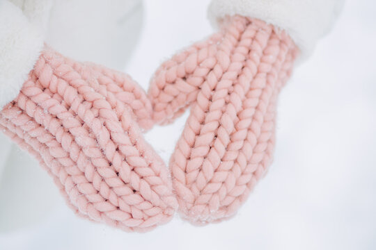 Close-up of a woman in pink mittens outdoors in a city park in winter.