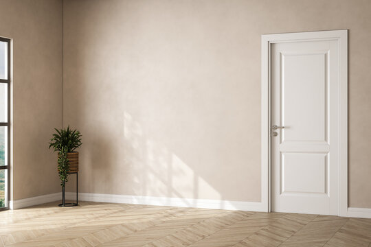 Modern and minimalist interior of living room ,empty room ,beige wall and wooden floor, plant.