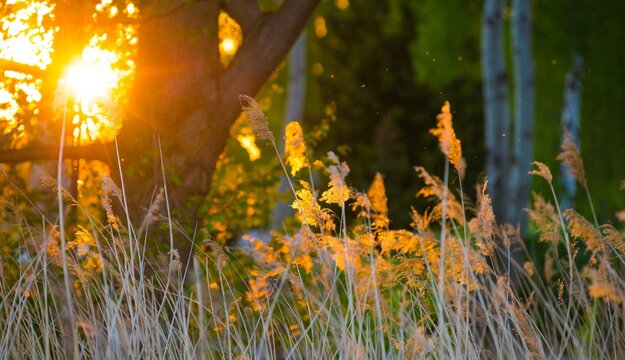 The warm light of the setting sun penetrates the grasses and trees, summer evening in the forest by the lake, rays of light, reed fronds glowing in the light, common reed (Phragmites australis)