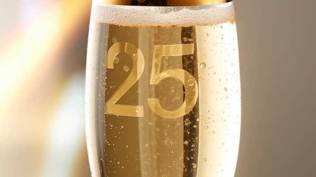 Showing tall champagne flute rising bubbles and foam while warm left light intensifying, gold 25