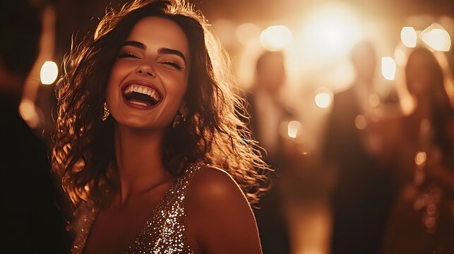 A woman in a sparkling gown, laughing with friends as they dance together at a chic indoor event, their faces filled with joy and excitement under the warm party lights