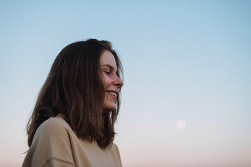 Close-up of a woman with curly hair in casual wear during warm light. Expressions reflect calmness and serenity, capturing a moment of quiet contemplation