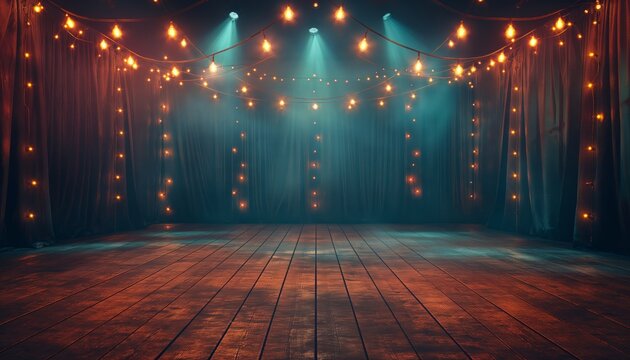 Stage lights illuminate a wooden floor with a vibrant blue and red glow.