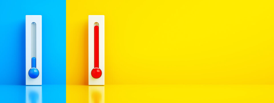 blue and red thermometers over bright background, regulation of the air conditioner in any weather, 3d rendering, panoramic image