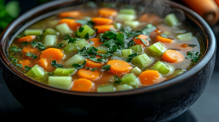 A steaming bowl of homemade vegetable soup with fresh ingredients like carrots, celery, and herbs, highlighting the importance of healthy, comforting meals