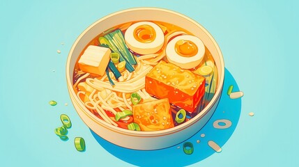 Vibrant bowl of noodle soup, colorful ingredients like carrots and eggs, warm meal in a cozy setting, inviting and delicious.