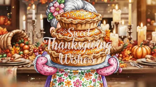 gentle cartoony watercolor of grandma carrying warm pumpkin pies through a luxuriously decorated home for sweet thanksgiving wishes greeting
