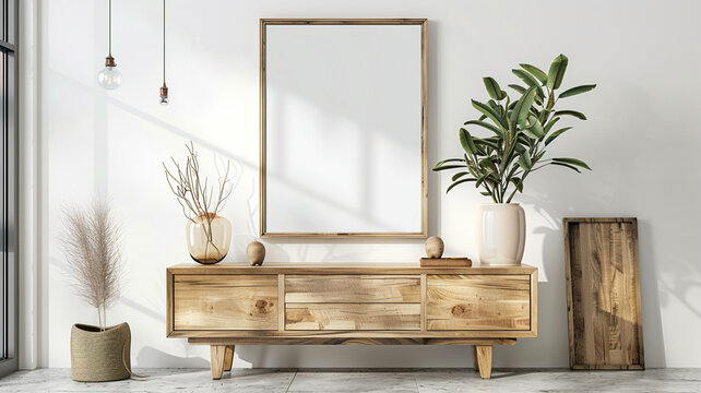 wooden frame mockup on the sideboard of a boho interior style on white wall background