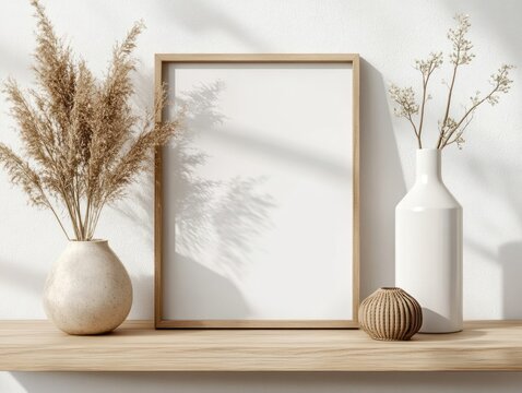 Photo frame mockup in a living room with soft light casting shadows on a white wall, adorned with wooden decor and dry grass
