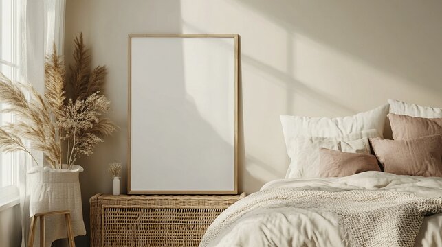 Mock-up frame leaning against the wall on a wooden console, cozy bedroom with wicker furniture, soft neutral bedding, warm tones, potted plant nearby, 3D render.