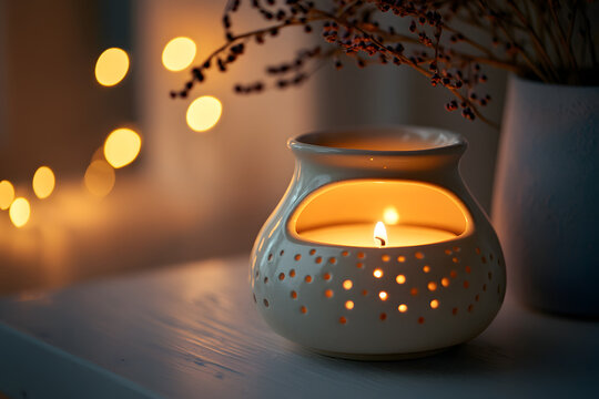 a ceramic butter warmer with a tealight candle underneath, the soft, ambient light creating a cozy atmosphere