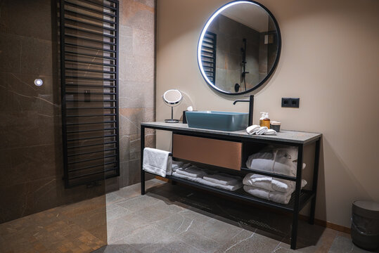Luxurious bathroom featuring a circular backlit mirror, black vanity, stone tiles, glass shower enclosure, and black towel warmer in South Tyrol, Italy.