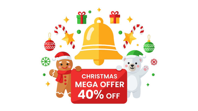 Christmas Mega Offer: Festive illustrations of a Gingerbread Man, Polar Bear, and a golden bell, surrounded by whimsical elements, announce a Mega Offer with a 40% discount.