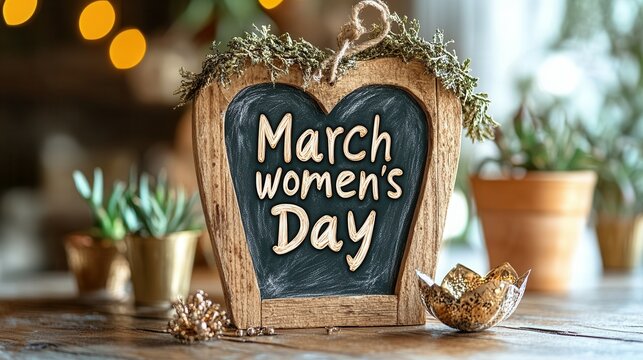 A beautifully crafted wooden sign adorned with greenery announces Women's Day in March. Surrounded by potted plants and decorative items, this cozy atmosphere highlights the celebration of women's ach