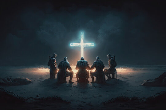 Warriors on foggy sunset background fighting in a medieval battle scene with cavalry and infantry