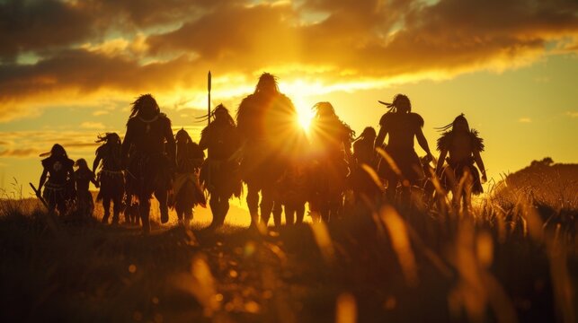 The sun sets behind a group of Maori warriors as they prepare for battle their shadows stretching long and their spirits ready to face any challenge that comes their way.