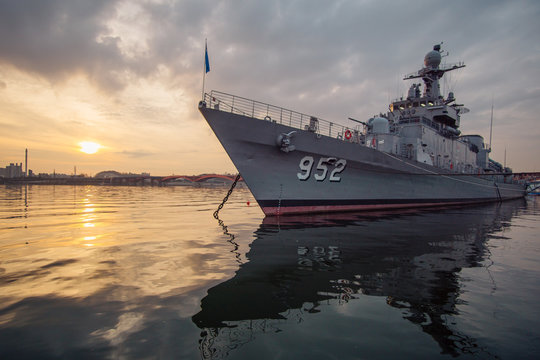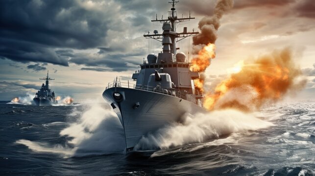 Silhouetted naval warship against a serene and colorful sunset backdrop on the calm sea