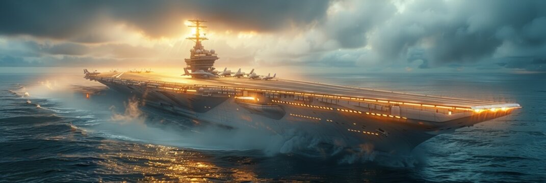 Nuclear ship, Military navy ship carrier full loading fighter jet aircraft for prepare troops,  webinar banner  forwarder mast