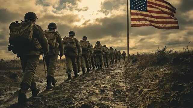 Soldiers march through muddy path toward American flag under dramatic sky during wartime