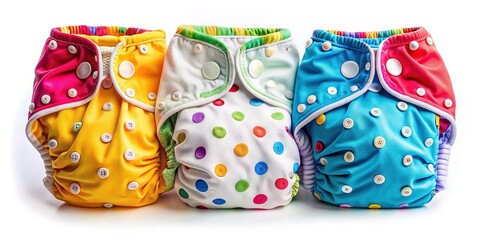 Colorful washable cloth diapers with absorbent inserts and colorful snaps laid out on a clean white background, showcasing eco-friendly and sustainable baby care options.