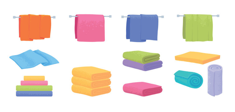 Bath towels. Cartoon fabric towel hanging on ring, rolled color cloth towels and folded towel vector illustration set. Towel bath for hygiene, bathroom textile