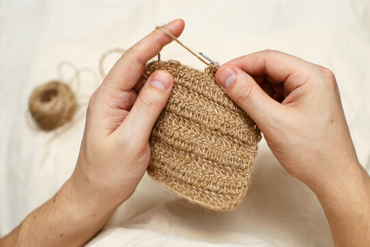 a man crochets an eco-friendly washcloth from flax jute. Zero waste concept. Knitting as a way of relaxation. Eco-friendly solutions for everyday life.