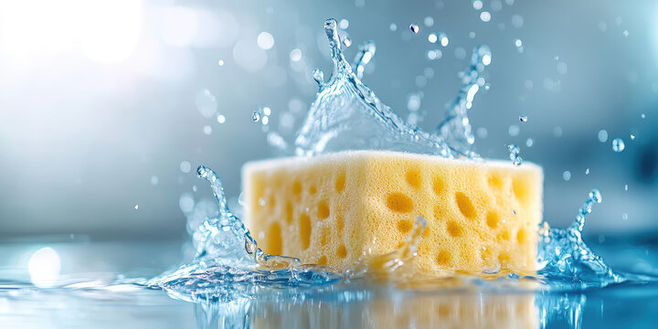 Kitchen sponge actively soaking up spilled water, splashes and drops water in motion, absorbing absorption