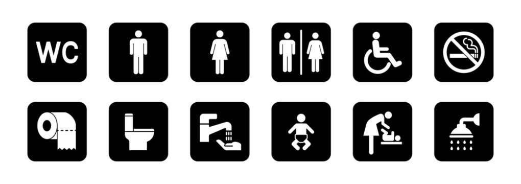Toilet icon set. WC sign. Washroom, male, female, unisex accessible, baby changing table room, shower, handicap, No smoking symbol. Public bathroom pictogram. Transparent png and vector illustration.