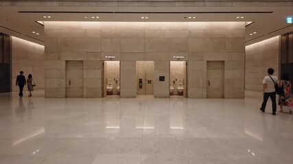 Fixed wide shot establishing the expansive clean interior of a modern public area showing the symmetric entrance to the neutral tiled washroom geometric layout, floor plan, polished floor