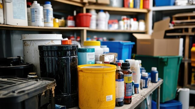 Various household hazardous waste containers, such as cleaning products and batteries, organized for disposal.