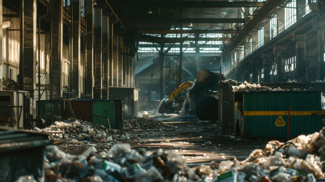 An indoor factory building filled with pollution, its ground littered with heaps of garbage, depicting the harsh reality of our wasteful society