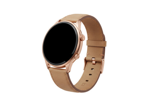 Isolated rose gold smart watch with leather strap on seamless background for e-commerce