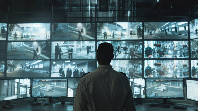 A security operator monitors multiple screens displaying citywide surveillance footage in a dimly lit control room, showcasing advanced urban monitoring technology and public safety management.