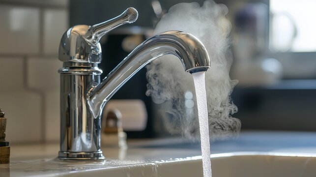 Running tap with steam symbolizes water conservation and heating costs.