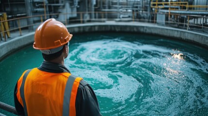 A worker in safety gear observes swirling water in a large industrial tank, emphasizing the importance of safety in a processing facility.