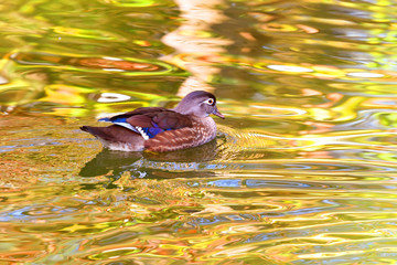 A close-up portrait of a female Wood Duck swimming in water with a smooth background in soft light.