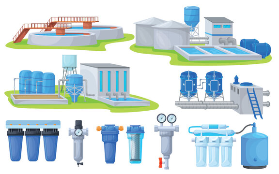 Water purification industry. Wastewater treatment industrial aqua filters, watertank clean liquid reservoir plant sewage filtration tubes pipe system, set neat vector illustration