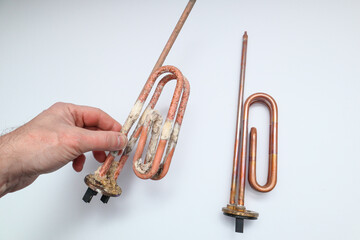 Old broken and new electric heaters of washing machine close up, repair of household equipment Mechanical technology industry concept. Comparision of two heaters. New washing machine part and old cove