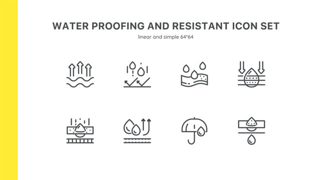 Water Quality and Management Icon Set: Enhancing Safety and Efficiency in Water Use. Features Droplets, Shields, Gears, Magnifying Glasses, and Chlorination.  Water Control, Reduction and Savings Icon