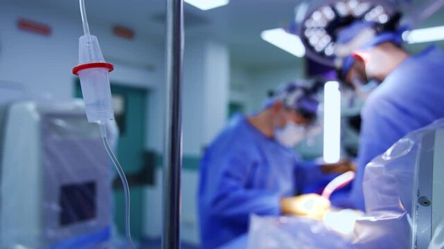 Drop counter with saline solution. Close up. Two male surgeons operate patient at blurred backdrop.
