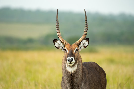 Waterbuck (Kobus ellipsiprymnus). After a heavy rain shower the wet waterbuck male is standing on the savannah of the Masai Mara National Park in Kenya