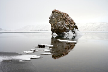 AERIAL, CLOSE UP: Rocky riverbank and water surface reflecting golden sky