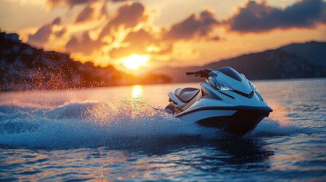 White jet ski speeding across the water at sunset. Golden hour light creates a stunning backdrop.