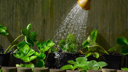 Watering plants. Watering strawberries from a watering can, garden crops are watered from a watering can.
